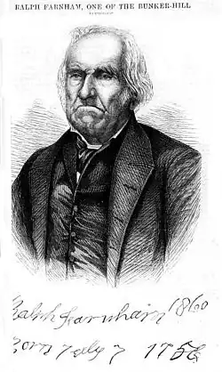 A significant number of notable American patriots fought in this battle. Henry Dearborn and William Eustis, for example, went on to distinguished military and political careers; both served in Congress, the Cabinet, and in diplomatic posts. Others, like John Brooks, Henry Burbeck, Christian Febiger, Thomas Knowlton, and John Stark, became well known for later actions in the war.[121][122] Stark became known as the "Hero of Bennington" for his role in the 1777 Battle of Bennington. Free African-Americans also fought in the battle; notable examples include Barzillai Lew, Salem Poor, and Peter Salem.[123][124] Another notable participant was Daniel Shays, who later became famous for his army of protest in Shays's Rebellion.[125] Israel Potter was immortalized in Israel Potter: His Fifty Years of Exile, a novel by Herman Melville.[126][127] Colonel John Paterson commanded the Massachusetts First Militia, served in Shays's Rebellion, and became a congressman from New York.[128] Lt. Col. Seth Read, who served under John Paterson at Bunker Hill, went on to settle Geneva, New York and Erie, Pennsylvania, and was said to have been instrumental in the phrase E pluribus unum being added to U.S. coins.[129][130][131][132] George Claghorn of the Massachusetts militia was shot in the knee at Bunker Hill and went on after the war to become the master builder of the USS Constitution.[133]