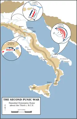 Shortly after the start of the Second Punic War, Hannibal crossed into Italy by traversing the Pyrenees and the Alps during the summer and early autumn of 218 BC.[7] He quickly won major victories over the Romans at Trebia and at Lake Trasimene.[8][9] After these losses, the Romans appointed Quintus Fabius Maximus Verrucosus as dictator to deal with the threat.[10][11]