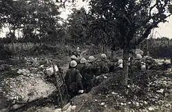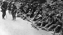 Italian losses were enormous: 13,000 were killed, 30,000 wounded and 265,000–275,000 were taken prisoner.[29][8][30] Morale was so low among the Italian troops, mainly due to Cadorna's harsh disciplinary regime, that most of these surrendered willingly.[24] 3,152 artillery pieces, 3,000 machine guns and 1,712 mortars were lost,[29] along with a vast amount of stores and equipment.[24][a] In contrast, the Austro-Hungarians and Germans sustained around 70,000 casualties.[30][29][b]