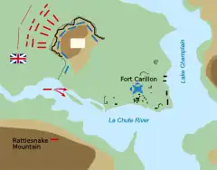 Abercrombie held a war council that evening. The options he presented to his staff were limited to asking if the next day's attack should be in three ranks or four; the council opted for three.[44] Abercrombie's plan of attack omitted Clerk's recommendation to fortify the summit of Rattlesnake Hill; in addition to the frontal assault, 4 six-pound guns and a howitzer were to be floated down the La Chute River and mounted at the base of Rattlesnake Hill, with 20 bateaux of troops to support the effort.[45]