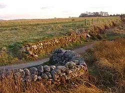 It was the last pitched battle fought on British soil.[63] Today, a visitor centre is located near the site of the battle. It was first opened in December 2007, with the intention of preserving the battlefield in a condition similar to how it was on 16 April 1746.[64] One difference is that it is currently covered in shrubs and heather. During the 18th century, however, the area was used as common grazing ground, mainly for tenants of the Culloden estate.[65] Those visiting can walk the site by way of footpaths on the ground and can also enjoy a view from above on a raised platform.[66] Possibly the most recognisable feature of the battlefield today is the 20-foot (6 m)-tall memorial cairn, erected by Duncan Forbes in 1881.[62] In the same year, Forbes also erected headstones to mark the mass graves of the clans.[67] The thatched roofed farmhouse of Leanach that stands today dates from about 1760; however, it stands on the same location as the turf-walled cottage that probably served as a field hospital for government troops following the battle.[65] A stone, known as "The English Stone", is situated west of the Old Leanach cottage and is said to mark the burial place of the government dead.[68] West of this site lies another stone, erected by Forbes to mark the place that the body of Alexander McGillivray of Dunmaglass was found after the battle.[69][70] A stone lies on the eastern side of the battlefield and is supposed to mark the spot from which Cumberland directed the battle.[71] The battlefield has been inventoried and protected by Historic Scotland under the Historic Environment (Amendment) Act 2011.[72]