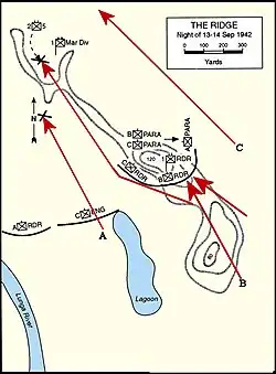 Oka's unit of about 650 men attacked the Marines at several locations on the west side of the Lunga perimeter. At about 04:00 on 14 September, two Japanese companies attacked positions held by the 3rd Battalion, 5th Marine Regiment (3/5) near the coast and were thrown back with heavy losses. Another Japanese company captured a small ridge somewhat inland but was then pinned down by Marine artillery fire throughout the day and took heavy losses before withdrawing on the evening of 14 September. The rest of Oka's unit failed to find the Marine lines and did not participate in the attack.[49]