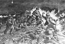 As the Marines formed into a horseshoe-shaped line around Hill 123, Tamura's battalion began a series of frontal assaults on the hill, charging up the saddle from Hill 80 and up from below the east side of the ridge. Under the light of parachute flares dropped by at least one Japanese floatplane, the Marines repulsed the first two attacks by Tamura's men. Tamura's troops hoisted a 75 mm (2.95 in) "regimental" gun to the top of Hill 80 in an effort to fire it directly at the Marines. This gun, which "could have turned the tide in favor of the Japanese," however, was disabled by a faulty firing pin. At midnight, during a short lull in the fighting, Edson ordered Parachute Companies B and C to advance from behind Hill 123 to strengthen his left flank. With fixed bayonets, the Paramarines swept forward, killing Japanese soldiers who had overrun the Marine lines and were apparently preparing to roll up the Marine lines from the flank, and took position on the east side of the hill. Marines from other units, as well as members of Edson's command staff, including Major Bailey, took ammunition and grenades under fire to the Marines around Hill 123, who were running critically low. Said Marine participant Captain William J. McKennan, "The Japanese attack was almost constant, like a rain that subsides for a moment and then pours the harder ... When one wave was mowed down—and I mean mowed down—another followed it into death."[42]