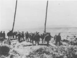At 13:05 on 14 September, Kawaguchi led the survivors of his shattered brigade away from the ridge and deeper into the jungle, where they rested and tended to their wounded all the next day. Kawaguchi's units were then ordered to withdraw west to the Matanikau River valley to join with Oka's unit, a 6 mi (9.7 km) march over difficult terrain. Kawaguchi's troops began the march on the morning of 16 September.[50] Almost every soldier able to walk had to help carry the wounded. As the march progressed, the exhausted and hungry soldiers, who had eaten their last rations on the morning before their withdrawal, began to discard their heavy equipment and then their rifles. By the time most of them reached Oka's positions at Kokumbona five days later, only half still carried their weapons. The Kuma battalion's survivors, attempting to follow Kawaguchi's Center Body forces, became lost, wandered for three weeks in the jungle, and almost starved to death before finally reaching Kawaguchi's camp.[51]