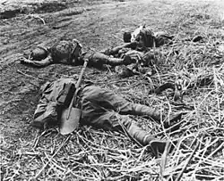 - ^ Alexander, p. 150; Christ, p. 208; Frank, Guadalcanal, pp. 231–232; Griffith, Battle for Guadalcanal, p. 140; Peatross, Bless 'em All, pp. 102–103; and Smith, Bloody Ridge, pp. 146–151. Kukusho's men attacked along both sides of the lagoon and captured at least six of the Marines' machine-guns (Alexander p. 166). Eleven of the Marines killed were listed as "missing", although they were never seen alive again; the few Marine bodies recovered after the battle were so decomposed that identification was impossible. Some Marines reported hearing the sounds (screams) of one or more captured Marines being tortured throughout the night of 12 September. Said Robert Youngdeer who was present on the ridge that night, "The sound of someone being worked over out there in the darkness remains with me until this day. The whole battalion could hear their screams" (Alexander, p. 153).