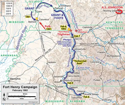 Grant wasted no time, leaving Cairo, Illinois, at the confluence of the Mississippi and Ohio Rivers, on February 2. His invasion force, which arrived on the Tennessee River on February 4 and 5,[8] consisted of 15,000–17,000 men in two divisions, commanded by Brig. Gens. John A. McClernand and Charles F. Smith, supported by the Western Gunboat Flotilla, commanded by United States Navy Flag Officer Andrew Hull Foote. The flotilla included four ironclad gunboats (flagship USS Cincinnati, USS Carondelet, USS St. Louis, and USS Essex) under Foote's direct command, and three timberclad gunboats (USS Conestoga, USS Tyler, and USS Lexington) under Lt. Seth Ledyard Phelps. Insufficient transport ships this early in the war to deliver all of the army troops in a single operation required two trips upriver to reach the fort.[1] General Johnston was pressured by the confederate government to defend the Mississippi, Cumberland, and Tennessee rivers, and the important railroads in the region, to which end he concentrated his forces at Columbus, Forts Henry and Donelson, Russellville, Bowling Green, and the Cumberland Gap in eastern Kentucky. When Beauregard arrived at Bowling Green, he expected "to find 40,000 Confederate soldiers at Bowling Green and another 30,000 at Columbus, ready to assume the offensive. Instead, he was shocked to see an army of some 14,000 effectives at Bowling Green, with deficient arms, equipment, and transportation... Beauregard, 'realizing how useless his presence would be to General Johnston, under the existing circumstances, informed the latter that, in his opinion, he had best return at once to Virginia."[9] Johnston convinced Beauregard to remain, but the latter was too ill to assume command of Forts Henry and Donelson. This was unfortunate as Johnston desperately needed an officer with Beauregard's engineering skill to defend the Tennessee and Cumberland rivers. Fort Henry was considered a liability due to its poor position and engineering which made it highly susceptible to being flooded during high tide and rain, and was garrisoned by a token force of 3,000-4,000 including the crews for the heavy guns. Johnston ordered Tilghman to place naval mines in the Tennessee River to help defend Fort Henry, and to construct Fort Heiman on the hills opposite the fort on the Kentucky side of the Tennessee River to prevent its bombardment by Federal artillery.[10]