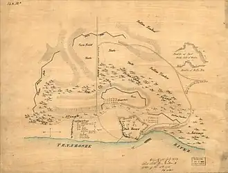 Fort Henry was a five-sided, open-bastioned earthen structure covering 10 acres (0.04 km2) on the eastern bank of the Tennessee River, near Kirkman's Old Landing.[11] The site was about one mile above Panther Creek and about six miles below the mouth of the Big Sandy River and Standing Rock Creek.[12]