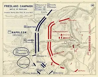 - ^ a b Tucker S. C. A Global Chronology of Conflict: From the Ancient World to the Modern Middle East. ABC-CLIO. 2009. p. 1055: "The Battle of Friedland of June 14, 1807, pits Napoleon with 80,000 men against Bennigsen with only 60,000".