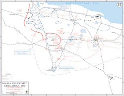 The Battle of Gazala, also the Gazala Offensive (Italian: Battaglia di Ain el-Gazala) was fought near the village of Gazala during the Western Desert Campaign of the Second World War, west of the port of Tobruk in Libya, from 26 May to 21 June 1942. Axis troops consisting of German (Panzerarmee Afrika; Generaloberst Erwin Rommel) and Italian units fought the British Eighth Army (General Sir Claude Auchinleck, also Commander-in-Chief Middle East) composed mainly of British Commonwealth, Indian and Free French troops.