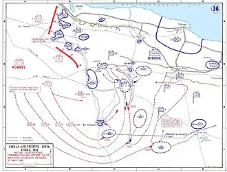 The rest of the XX Motorized Corps and the 101st Motorised Division "Trieste", would open a gap in the minefield north of the Bir Hakeim box near the Sidi Muftah box, to create a supply route to the armour. Rommel anticipated that, having dealt with the Allied armour, he would capture El Adem, Ed Duda, Sidi Rezegh and "Knightsbridge". The Axis tanks would then be in a position to attack on the following day westwards against the Eighth Army defensive boxes between Gazala and Alem Hamza, meeting the eastwards attack by X Corps and XXI Corps.[20] By late May, the Axis forces comprised 90,000 men, 560 tanks and 542 aircraft.[13][14] On 26 May, Comando Supremo ordered Bastico and Rommel to launch the offensive, defeat the British armoured forces and capture Tobruk.[21]