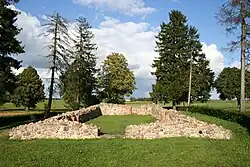 The first more thorough archaeological excavations of the battlefield were carried out in 1958–1960 in the run-up to the 550th anniversary, connected to the construction of the memorial site and museum. The government showed great interest in the excavations and sent helicopters and 160 soldiers to help.[111] Research continued in later decades, but yielded very little results with the exception of the area around the ruined chapel.[113][102] Several mass graves were found at the chapel: remains of six people in the vestibule, 30 people next to the southern wall, more than 130 people in three pits adjacent to the chapel, and about 90 people in the sacristy. Many remains showed signs of traumatic injuries. Some skeletons showed signs of being burned and moved.[111] Mass burials, including of women and children, were also found in the villages of Gilgenburg (Dąbrówno) and Faulen (Ulnowo). The massacre in Gilgenburg was known from written sources, but the burial in Faulen was unexpected.[111] In the fields, very few items of militaria were found. In 1958–1990, only 28 artefacts were found connected to the battle: ten crossbow bolts, five arrowheads, a javelin head, two sword pieces, two gun bullets, six pieces of gauntlets, and two small arms bullets.[111]