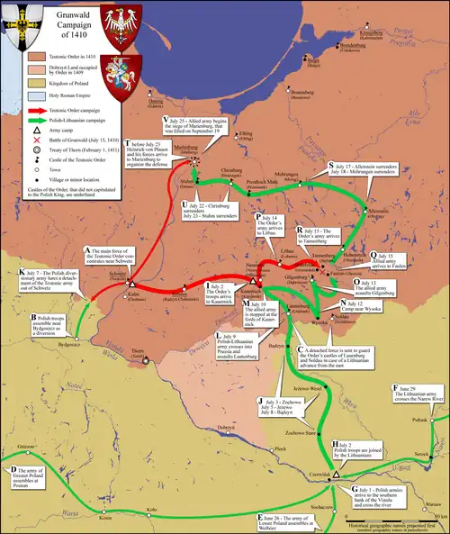 After the battle, the Polish and Lithuanian forces delayed their attack on the Teutonic capital in Marienburg (Malbork), remaining on the battlefield for three days and then marching an average of only about 15 km (9.3 mi) per day.[88] The main forces did not reach heavily fortified Marienburg until 26 July. This delay gave Heinrich von Plauen enough time to organize a defense. Władysław II Jagiełło also sent his troops to other Teutonic fortresses, which often surrendered without resistance,[89] including the major cities of Danzig (Gdańsk), Thorn (Toruń), and Elbing (Elbląg).[90] Only eight castles remained in Teutonic hands.[91] The besiegers of Marienburg expected a speedy capitulation and were not prepared for a long siege, suffering from lack of ammunition, low morale, and an epidemic of dysentery.[92] The order appealed to their allies for help, and Sigismund of Hungary, Wenceslaus, King of the Romans, and the Livonian Order promised financial aid and reinforcements.[93]