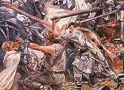 At that time the reorganized Lithuanians returned to the battle, attacking von Jungingen from the rear.[76] The Teutonic forces were by then becoming outnumbered by the mass of Polish knights and advancing Lithuanian cavalry. As von Jungingen attempted to break through the Lithuanian lines, he was killed.[76] According to Cronica conflictus, Dobiesław of Oleśnica thrust a lance through the Grand Master's neck,[76] while Długosz presented Mszczuj of Skrzynno as the killer. Surrounded and leaderless, the Teutonic Order began to retreat. Part of the routed units retreated towards their camp. This move backfired when the camp followers turned against their masters and joined the manhunt.[77] The knights attempted to build a wagon fort: the camp was surrounded by wagons serving as an improvised fortification.[77] However, the defense was soon broken and the camp was ravaged. According to Cronica conflictus, more knights died there than on the battlefield.[77] The battle lasted for about ten hours.[39]