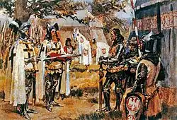 In the early morning of 15 July, both armies met in an area covering approximately 4 km2 (1.5 sq mi) between the villages of Grunwald, Tannenberg (Stębark) and Ludwigsdorf (Łodwigowo).[61] The armies formed opposing lines along a northeast–southwest axis. The Polish–Lithuanian army was positioned in front and east of Ludwigsdorf and Tannenberg.[62] Polish heavy cavalry formed the left flank, Lithuanian light cavalry the right flank and various mercenary troops made up the center. Their men were organized in three lines of wedge-shaped formations about 20 men deep.[62] The Teutonic forces concentrated their elite heavy cavalry, commanded by Grand Marshal Frederic von Wallenrode, against the Lithuanians.[61] The order, which was the first to organize their army for the battle, hoped to provoke the Poles or Lithuanians into attacking first. Their troops, wearing heavy armor, had to stand in the scorching sun for several hours waiting for an attack.[63] One chronicle suggested that they had dug pits that an attacking army would fall into.[64] They also attempted to use field artillery, but a light rain dampened their powder and only two cannon shots were fired.[63] As Władysław II Jagiełło delayed, the Grand Master sent messengers with two swords to "assist Władysław II Jagiełło and Vytautas in battle". The swords were meant as an insult and a provocation.[65] Known as the "Grunwald Swords", they became one of the national symbols of Poland.
