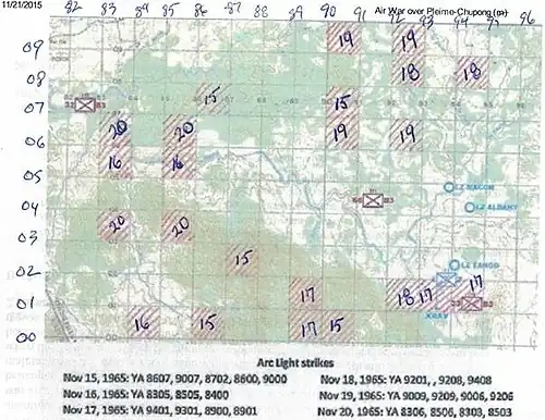 At 18:50, Gen. Kinnard discussed with Gen. Larsen the possibility of having a B-52 strike at the area of LZ X-Ray. At 21:00 the 1st Air Cavalry selected coordinates for B-52 strike in Code – YA 870000, YA 830000, YA 830070, YA 870070 with alternative targets (in Code) YA 8607, YA 9007, YA 9000, YA 8600.[23]