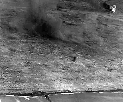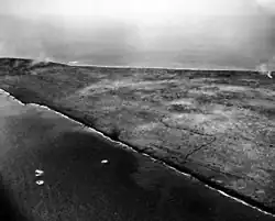 Furthermore, after crossing the beach, the Marines were faced with 15 ft-high (4.6 m) slopes of soft black volcanic ash.[37] This ash allowed for neither secure footing nor the construction of foxholes to protect the Marines from hostile fire. However, the ash did help to absorb some of the fragments from Japanese artillery.[40]
