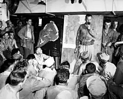 During the night of 18 February 1945, Vice Admiral Marc Mitscher's large carrier force, Task Force 58, arrived off Iwo Jima. Also in this flotilla was Admiral Raymond A. Spruance, the overall commander for the invasion, in his flagship USS Indianapolis. Smith was once again deeply frustrated that Mitscher's powerful carrier group had been bombing the Japanese home islands instead of softening the defenses of Iwo Jima. Mitscher's fliers did, however, assist the additional surface vessel bombardment that accompanied the launch of the amphibious landing craft toward the island.[35]