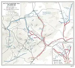 The battle was the first major engagement between U.S. and Axis forces in Africa. The initial handful of American battalions suffered many casualties and were successively pushed back over 50 miles (80 km) from their original positions west of Faïd Pass, until they met an advancing brigade of the U.S. 1st Armored Division.[8] British forces were also driven back, losing all 11 of their tanks in the process.[9] After the initial reversal, Allied reinforcements with strong artillery support stopped the Axis advance, and an American counterattack recaptured the mountain passes in western Tunisia, defeating the Axis offensive. The Axis force was overextended and pinned down by the Allied artillery. Facing counterattacks and airstrikes, they withdrew from the Kasserine Pass by 24 February.