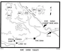 James Marino wrote that in 1964, General William Westmoreland, the US commander in Vietnam, had determined, "Khe Sanh could serve as a patrol base blocking enemy infiltration from Laos; a base for... operations to harass the enemy in Laos; an airstrip for reconnaissance to survey the Ho Chi Minh Trail; a western anchor for the defenses south of the DMZ; and an eventual jumping-off point for ground operations to cut the Ho Chi Minh Trail."[24] In November 1964, the Special Forces moved their camp to the Xom Cham Plateau, the future site of Khe Sanh Combat Base.[25]