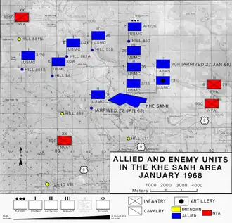 The Battle of Khe Sanh (21 January – 9 July 1968) was conducted in the Khe Sanh area of northwestern Quảng Trị Province, Republic of Vietnam (South Vietnam), during the Vietnam War. The main US forces defending Khe Sanh Combat Base (KSCB) were two regiments of the United States Marine Corps supported by elements from the United States Army, the United States Air Force (USAF) and the RAAF, as well as a small number of Army of the Republic of Vietnam (ARVN) troops. These were pitted against two to three divisional-size elements of the North Vietnamese People's Army of Vietnam (PAVN).