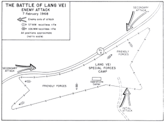Not much activity (with the exception of patrolling) had occurred thus far during the battle for the Special Forces Detachment A-101 and their four companies of Bru CIDGs stationed at Lang Vei. Then, on the morning of 6 February, the PAVN fired mortars into the Lang Vei compound, wounding eight Camp Strike Force soldiers.[61] At 18:10 hours, the PAVN followed up their morning mortar attack with an artillery strike from 152 mm howitzers, firing 60 rounds into the camp. The strike wounded two more Strike Force soldiers and damaged two bunkers.[61]