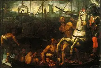 Oarsmen were mainly drawn from local Greek populations, who were experienced in maritime affairs,[35] although there were some Venetian oarsmen as well.[37] Free oarsmen were generally acknowledged to be superior to enslaved or imprisoned oarsmen, but the former were gradually replaced in all galley fleets (including those of Venice from 1549) during the 16th century by cheaper slaves, convicts, and prisoners-of-war owing to rapidly rising costs.[38] The Venetian oarsmen were mainly free citizens and able to bear arms, adding to the fighting power of their ships, whereas convicts were used to row many of the galleys in other Holy League squadrons.[37]