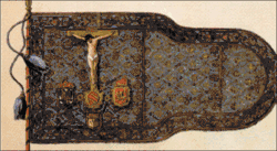 The banner for the fleet, blessed by the Pope, reached the Kingdom of Naples (then ruled by Philip II of Spain) on 14 August 1571, where it was solemnly consigned to John of Austria.[22]