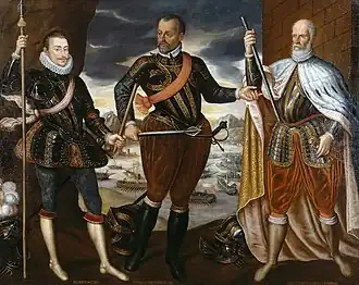 Tommaso Dolabella painted his The Battle of Lepanto in c. 1625–1630 on the commission of Stanisław Lubomirski, commander of the Polish left wing in the Battle of Khotyn (1621). The monumental painting (3.05 m × 6.35 m) combines the Polish victory procession following this battle with the backdrop of the Battle of Lepanto. It was later owned by the Dominicans of Poznań and since 1927 has been on display in Wawel Castle, Kraków.[75]