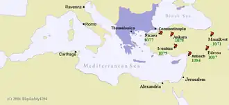 In hindsight, both Byzantine and modern historians are unanimous in dating the decline of Byzantine fortunes to this battle. As Paul K. Davis writes, "Byzantine defeat severely limited the power of the Byzantines by denying them control over Anatolia, the major recruiting ground for soldiers. Henceforth, the Muslims controlled the region. The Byzantine Empire was limited to the area immediately around Constantinople, and the Byzantines were never again a serious military force."[48] It is also seen as one of the root causes for the later Crusades, in that the First Crusade of 1095 was originally a western response to the Byzantine emperor's call for military assistance after the loss of Anatolia.[49] From another perspective, the West saw Manzikert as a signal that Byzantium was no longer capable of being the protector of Eastern Christianity or of Christian pilgrims to the Holy Places in the Middle East. Delbrück considers the battle's importance exaggerated, but the evidence makes clear that it resulted in the Empire's inability to put an effective army into the field for many years.[50]
