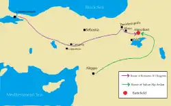 The march across Asia Minor was long and difficult. Romanos brought a luxurious baggage train, which did not endear him to his troops. The local population also suffered plundering by his Frankish mercenaries, whom he was obliged to dismiss. The expedition rested at Sebasteia on the Halys River, reaching Theodosiopolis in June 1071. Some of his generals suggested continuing the march into the Seljuk territory and catching Alp Arslan before he was ready. Others, including Nicephorus Bryennius, suggested they wait and fortify their position. It was decided to continue the march.[23] Then they moved to Khnus city. The Byzantine army, which was heading towards the Malazgirt Plain, chose the route of the Kocasu Stream flowing through Khnus as a route to meet its water needs, and the army manufactured the spears to be used in the war from the trees growing in Khnus and its surroundings.[24]