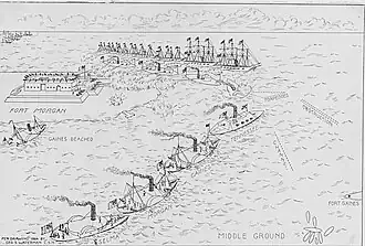 At the western end of the bay was Fort Powell, smallest of the three, with 18 guns and about 140 men. It was commanded in Page's absence by Lieutenant Colonel James M. Williams.[12] All three forts were flawed in that their guns were unprotected against fire from the rear; in addition, forts Powell and Gaines lacked adequate traverses.[13]