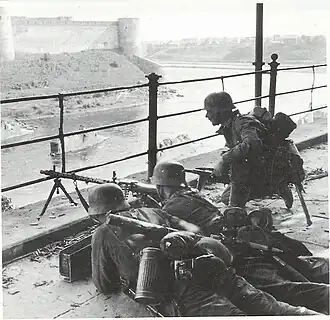 ![]() German soldiers defending the western bank of the Narva River, with the Ivangorod Fortress on the eastern side | |||||||