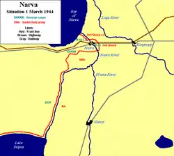 Three Soviet armies were deployed at the maximum concentration of forces in March 1944. The 2nd Shock Army was placed north of Narva, the 59th Army was positioned south of Narva, and the 8th Army south of the 59th Army, along the 50 km long Narva River stretching down to Lake Peipus. Detailed information on the size of the Soviet forces at the Narva front during the Winter-Spring campaign has not been published by any sources. It is impossible to give an overview on the Soviet strength until the Red Army archival information is published or made available to non-Russian investigators.[1] Estonian historian, Hannes Walter, has estimated the number of Soviet troops in the Battle of Narva at 205,000,[3] which accords with the number of divisions, multiplied by the sizes of the divisions assumed by the Estonian historian Mart Laar.[2] The order of battle of the Leningrad Front, as of 1 March 1944:[18]
