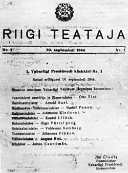 The lengthy German defence prevented a swift Soviet breakthrough into Estonia and gave the underground National Committee of the Republic of Estonia enough time to attempt to re-establish Estonian independence. On 1 August 1944, the national committee pronounced itself Estonia's highest authority and on 18 September 1944, acting head of state Uluots appointed a new government led by Otto Tief. Over the radio in English, the government declared its neutrality in the war. The government issued two editions of the Riigi Teataja (State Gazette) but did not have time to distribute them. On 21 September, the national forces seized the government buildings in Toompea, Tallinn and ordered the German forces to leave.[40][41] The flag of Estonia was hoisted at the tower of Pikk Hermann, to be removed by the Soviets four days later. The Estonian Government in Exile served to carry the continuity of the Estonian state forward until 1992, when it handed its credentials over to the incoming President, Lennart Meri.