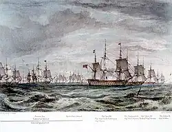 On 13 October, Codrington was joined off Navarino by a French squadron under Rigny and a Russian squadron under L. van Heiden. On 18 October, after futile attempts to contact Ibrahim Pasha, Codrington, in conference with his Allied colleagues, took the fateful decision to enter Navarino Bay and anchor his ships face-to-face with the Ottoman/Egyptian fleet. It was decided that with winter approaching, it was impracticable to maintain an effective blockade of Navarino, and that in any event, the population of the Peloponnese had to be safeguarded.[22] Although this was a highly provocative act, Codrington claimed that there was no intention to engage in battle, but only to make a show of force to induce the Ottomans to respect the armistice and to desist from atrocities against the civilian population.[23]
