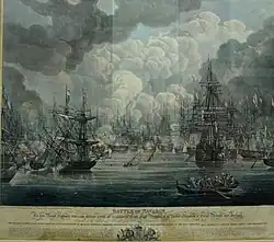 - The French ship Scipion (80 guns), behind Rigny's Sirène (60), immediately came under intense attack, by a combination of Egyptian frigates on both sides, the shore batteries and a fireship. The latter was nearly fatal. The fireship jammed under Scipion's bowsprit, the fore sails caught fire and the fire spread onto the upper gun-deck. Men flung themselves on the fire to prevent it spreading to the forward powder magazine, with inevitable horrendous burn injuries. Nevertheless, the gunners continued to fire on the attackers. Scipion was saved from destruction by her sister ship Trident (74), which succeeded in attaching a tow-line to the fireship and, with the assistance of Dartmouth and two other British boats, pulling it clear.[30]