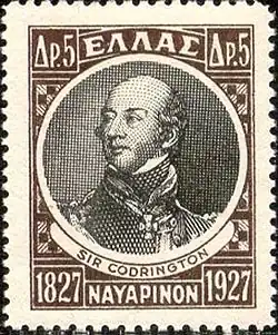 A secret clause in the agreement provided that if the Ottomans failed to accept the armistice within a month, each signatory Power would despatch a consul to Nafplion, the capital of the Hellenic Republic, thereby granting de facto recognition to the rebel government, something no Power had done hitherto.[11] The same clause authorized the signatories in concert to instruct their naval commanders in the Mediterranean to "take all measures that circumstances may suggest" (i.e. including military action) to enforce the Allied demands, if the Ottomans failed to comply within the specified time limit. However, the clause added that Allied commanders should not take sides in the conflict.[12] On 20 August 1827, the British naval commander-in-chief in the Mediterranean, Vice-Admiral of the Blue Sir Edward Codrington, a veteran of 44 years at sea and a popular hero for his role in the Battle of Trafalgar, received his government's instructions regarding enforcement of the treaty. Codrington could not have been a less suitable person for a task which required great tact. An impetuous fighting sailor, he entirely lacked diplomatic finesse, a quality he despised and derisively ascribed to his French counterpart, Henri de Rigny. He was also a sympathiser with the Greek cause, having subscribed to the London Philhellenic Committee.[13]