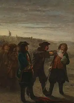 After a brief pause, Marlborough's equerry, Colonel Bringfield (or Bingfield), led up another of the Duke's spare horses; but while assisting him onto his mount, the unfortunate Bringfield was hit by an errant cannonball that sheared off his head. One account has it that the cannonball flew between the Captain-General's legs before hitting the unfortunate colonel, whose torso fell at Marlborough's feet – a moment subsequently depicted in a lurid set of contemporary playing cards.[62] Nevertheless, the danger passed and Overkirk and Tilly restored order among the confused squadrons and ordered them to attack again, enabling the Duke to attend to the positioning of the cavalry reinforcements feeding down from his right flank – a change of which Villeroi remained blissfully unaware.[64][65]