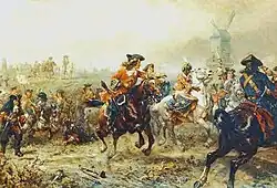 The initial clash favoured the Dutch and Danish squadrons. The disparity of numbers – exacerbated by Villeroi stripping their ranks of infantry to reinforce his left flank – enabled Overkirk's cavalry to throw the first line of French horse back in some disorder towards their second-line squadrons. This line also came under severe pressure and, in turn, was forced back to their third-line of cavalry and the few battalions still remaining on the plain.[58] But these French horsemen were amongst the best in Louis XIV's army – the Maison du Roi,[59] supported by four elite squadrons of Bavarian Cuirassiers. Ably led by de Guiscard, the French cavalry rallied, thrusting back the Allied squadrons in successful local counterattacks. On Overkirk's right flank, close to Ramillies, ten of his squadrons suddenly broke ranks and were scattered, riding headlong to the rear to recover their order, leaving the left flank of the Allied assault on Ramillies dangerously exposed. Notwithstanding the lack of infantry support, de Guiscard threw his cavalry forward in an attempt to split the Allied army in two.[60]