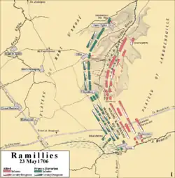 Marlborough, however, noticed several important weaknesses in the French dispositions.[37] Tactically, it was imperative for Villeroi to occupy Taviers on his right and Autre-Eglise on his left, but by adopting this posture he had been forced to over-extend his forces.[38] Moreover, this disposition – concave in relation to the Allied army – gave Marlborough the opportunity to form a more compact line, drawn up in a shorter front between the 'horns' of the French crescent; when the Allied blow came it would be more concentrated and carry more weight. Additionally, the Duke's disposition facilitated the transfer of troops across his front far more easily than his foe, a tactical advantage that would grow in importance as the events of the afternoon unfolded.[38] Although Villeroi had the option of enveloping the flanks of the Allied army as they deployed on the plateau of Jandrenouille – threatening to encircle their army – the Duke correctly gauged that the characteristically cautious French commander was intent on a defensive battle along the ridge-line.[39]