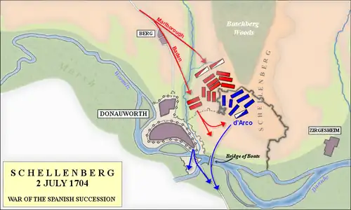The Allied cavalry began to appear at about 08:00, five miles (8 km) or six miles (9.7 km) away on d'Arco's left front to the north-west, followed by the infantry. By 10:00 Marlborough's Quartermaster-General, William Cadogan, began to mark out land for an encampment within sight of the Schellenberg – short of the Wörnitz – to give the impression they were intending a leisurely siege.[21] Count d'Arco watched Cadogan's preparations and, falling for the deception, left the supervision of the still incomplete defences to lunch with the French commander of Donauwörth, Colonel DuBordet, safe in the belief that he had the rest of the day and night to finish the defences.[22] However, the columns marched purposefully onwards, and by mid-afternoon they had crossed the river Wörnitz at Ebermorgen, intent on launching an immediate assault. The Allies were spotted by the Bavarian outposts who, after setting fire to Berg and surrounding hamlets, rushed off to sound the alarm. General d'Arco, rudely interrupted from his lunch, rushed up the Schellenberg and called his men to arms.[23]