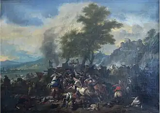 The outnumbered defenders of the Schellenberg had resisted the Allied assaults for two hours, but now under pressure from both Baden's and Marlborough's forces, their stalwart defence was over. As panic spread through the Franco-Bavarian army, Marlborough unleashed 35 squadrons of cavalry and dragoons to pursue the fleeing troops, ruthlessly cutting down the enemy soldiers to the shouts of "Kill, kill and destroy!"[43] There was no easy escape route. A pontoon bridge over the Danube had collapsed under their weight, and many of d'Arco's troops, most of whom could not swim, drowned trying to cross the fast-flowing river.[44] Many others who had been cut off on the northern shore of the Danube ran for their lives amongst the reed-beds, vainly endeavouring to avoid the Allied sabres. Others headed for the village of Zirgesheim, straining to escape to the wooded hills beyond. Only to the west could Marlborough detect a few Franco-Bavarian battalions crossing the Danube by Donauwörth's bridge in tolerable order, before darkness descended over the battlefield.[45]