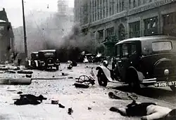 On August 14, 1937, the ROCAF bombed the Japanese Navy flagship Izumo.[59][60][61] But in what became known as "Black Saturday", bombs from ROCAF aircraft fell in the Shanghai International Settlement.[62][63] While the Chinese pilots were instructed not to fly over the Shanghai International Settlement, the Japanese flagship was berthed right in front of it; 700–950 Chinese and foreign civilians were killed outright,[62][63][64] with a total of 3,000 of civilian deaths and injuries resulting from the accidental release of the bombs, with most of the death occurring at the Great World entertainment centre, where civilian refugees had gathered after fleeing from the fighting.[65][66]