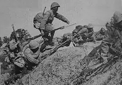 On September 19, 1937, the 18th infantry regiment broke into Wangzhai again, wiping out the 2nd company of the 4th regiment. The 468th regiment of the 78th division quickly sent a company to counterattack alongside the 4th regiment and fought fiercely until the next day to regain the position.[83]: 78–79 On the 20th, the 169th brigade of the 57th division took over the position of the 1st division at Zhangzhai, Wangzhai, and Wangjiufang (王九房). On the same day, the 3rd battalion of the 339th regiment of the brigade was attacked by the 18th infantry regiment at Wangzhai and held its ground despite losing more than half of its troops.[83]: 79 On September 21, the 78th division, which had defended Douzhai (竇宅) since the 16th, was replaced by the newly-arrived Hunanese 8th division. At the Jinjiawan area, the 159th division and the 34th infantry regiment were stuck in several days of tug-of-war, with heavy casualties on both sides. By dawn on September 23, the 952nd regiment, which was the main defending force, had only 1 regimental commander, 1 company commander, and just over 100 soldiers left. On September 23, the 3rd division bombarded the positions of the 66th corps with fierce artillery fire. Seven companies of the 159th division and two companies of the 160th division were completely annihilated under intensive bombardment and all positions were destroyed with no survivors.[83]: 87–89 The 34th infantry regiment finally occupied Jinjiawan and Seli (啬里).[86] In just a week of fighting, the 159th division had lost combat effectiveness and three of its four regiments had a total of just over 1,000 soldiers left.[87]