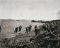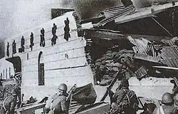 On August 19, two regiments of the 36th Division began their assault towards the wharf, enduring withering fire from Japanese defenders positioned on the roofs and upper floors of the buildings lining the streets. The Chinese were also subject to fierce bombardments from the Japanese Third Fleet anchored in the Huangpu.[47]