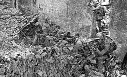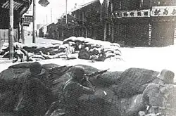 At the intersection of Zhoushan Road and Kunming Road, the Japanese SNLFs utilized fortifications and high-rise buildings to resist the attacking 212th regiment. Chinese soldiers had to use the bodies of the dead as cover to advance. The commander of the assault battalion was wounded, and brigade commander Chen Ruihe (陳瑞河) went to lead from the front until he too was seriously injured. The 2nd battalion of the 215th regiment was sent in the reinforce the 212th regiment. Battalion commander Li Zeng (李增) was killed immediately, while 300 soldiers from the battalion rushed into an alleyway to infiltrate the Japanese defenses through the buildings. In response, the SNLF blocked the entrance of the alleyway with two tanks and set the surrounding buildings on fire, killing all 300 men in the inferno.[48]: 274 [49]: 9 [50] The Japanese also lost tanks to Chinese anti-tank weapons within the battle's urban confines. 36th Division staff officer Xiong Xinmin saw a Chinese suicide bomber stop a Japanese tank column by strapping grenades to himself, diving beneath the lead tank and detonating the vest.[51]