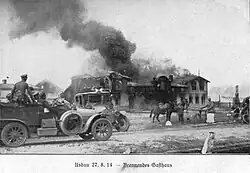On 21 August, Samsonov's 2nd Army crossed the border, and quickly took several border towns. The VI Corps took Ortelsburg, while I and XV Corps advanced onto Soldau and Neidenburg. On 22 August, Samsonov ordered XV Corps to advance towards Hohenstein, which they did on 23 August pushing Friedrich von Scholtz's XX Corps out of Lahna.[31]