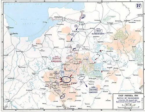 On the morning of 28 August the German commanders were motoring along the front when they were shown a report from an aerial observer that Rennenkampf's army was moving towards their rear. Ludendorff announced that the attack on the 2nd Army must be broken off. Hindenburg led him behind a nearby hedge; when they emerged Hindenburg calmly said that operations would continue as planned.[53] Later radio intercepts confirmed Rennenkampf was still slowly advancing on Königsberg. François' I Corps resumed his assault on the Russian 1st Army Corps, taking Soldau by late morning, and then advancing onto Neidenburg, as the Russian 1st Army Corps became an ineffective force in the battle. Scholtz's XX Corps, to the north, also advanced. Though his 41st Infantry Division was badly mauled by Martos' Russian 15th Army Corps, it held its ground, while the German 37th Infantry Division reached Hohenstein by the end of the day. The German 3rd Reserve Division was also able to advance on the Russian 15th Army Corps, forcing Samsonov to order a retreat to Neidenburg. Von Below's German I Reserve Corps engaged Klyuev's Russian 13th Army Corps west of Allenstein, and became isolated. Klyuev received orders from Samsonov to retreat towards Kurken. Mackensen's German XVII Corps continued pursuing the retreating Russians. One half of the German encirclement was complete by the end of the day, as Ludendorff wrote, "The enemy front seemed to be breaking up... We did not have a clear picture of the situation with individual units. But there was no doubt that the battle was won."[54]