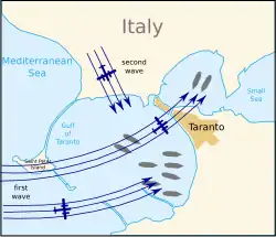 The first wave, which consisted of six Swordfish armed with torpedoes, two with flares and four 250 lb (110 kg) bombs, and four with six bombs, was split into two sections when three of the bombers and one torpedo bomber strayed from the main force while flying through thin clouds. The smaller group continued to Taranto independently. The main group approached the harbour at Mar Grande at 22:58. Sixteen flares were dropped east of the harbour, then the flare dropper and another aircraft made a dive bombing attack to set fire to oil tanks. The next three aircraft, led by Lieutenant Commander K Williamson RN of 815 Squadron, attacked over San Pietro Island, and struck the battleship Conte di Cavour with a torpedo that blasted a 27 ft (8.2 m) hole in her side below her waterline. Williamson's plane was immediately shot down by the Italian battleship's anti-aircraft guns.[10] The two remaining aircraft in this sub-flight continued, dodging barrage balloons and receiving heavy anti-aircraft fire from the Italian warships and shore batteries, to press home an unsuccessful attack on the battleship Andrea Doria. The next sub-flight of three attacked from a more northerly direction, attacking the battleship Littorio, hitting it with two torpedoes and launching one torpedo at the flagship, the battleship Vittorio Veneto, which missed. The bomber force, led by Captain O. Patch RM, attacked next. They found the targets difficult to identify, but attacked and hit two cruisers moored at Mar Piccolo hitting both with a single bomb each from 1,500 ft (460 m), followed by another aircraft that straddled four destroyers.[4]
