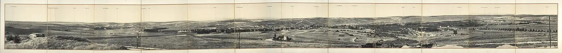 Four groups were established, under the command of Generals Adolphe Guillaumat, Balfourier and Denis Duchêne on the right bank and Georges de Bazelaire on the left bank. A "line of resistance" was established on the east bank from Souville to Thiaumont, around Fort Douaumont to Fort Vaux, Moulainville and along the ridge of the Woëvre. On the west bank, the line ran from Cumières to Mort Homme, Côte 304 and Avocourt. A "line of panic" was planned in secret as a final line of defence north of Verdun, through forts Belleville, St Michel and Moulainville.[25] I Corps and XX Corps arrived from 24 to 26 February, increasing the number of divisions in the RFV to 14+1⁄2. By 6 March, the arrival of the XIII, XXI, XIV and XXXIII corps had increased the total to 20+1⁄2 divisions.[26]